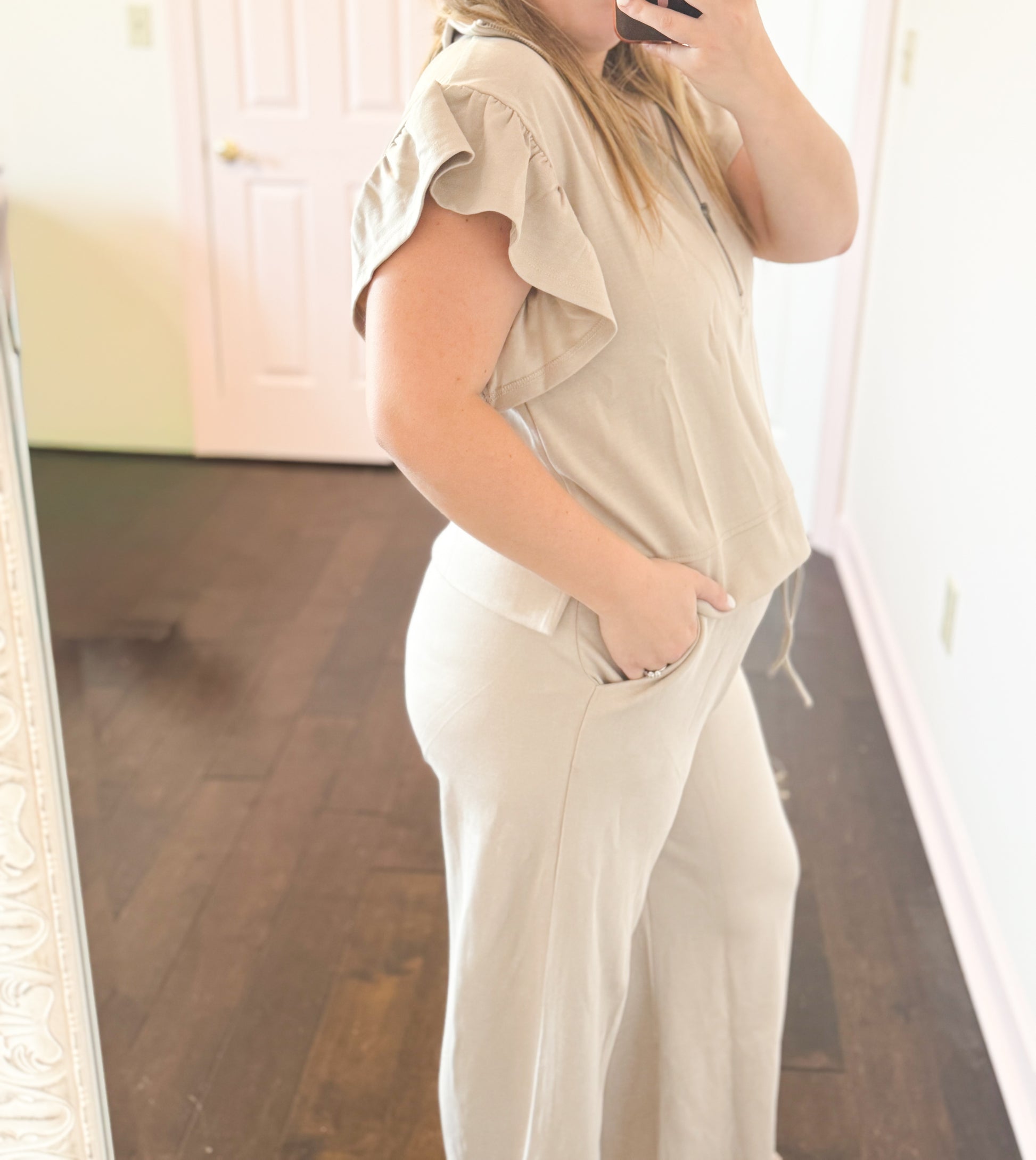- TOP: HALF-ZIP CLOSURE, RUFFLE SLEEVE, SIDE SLITS